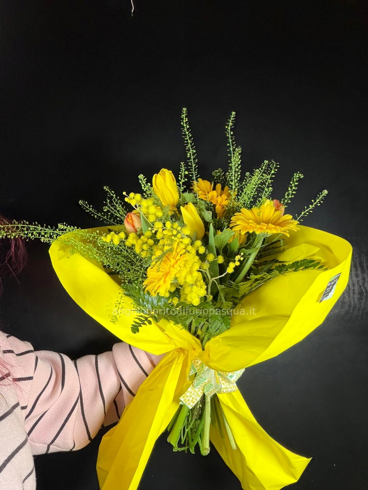 Bouquet con mimosa, girasoli, tulipani e gerbere sul tono del giallo. L'omaggio è sempre confezionato con carta o materiali simili e fiocco colorato, secondo la nostra sensibilità e come d'uso locale. Saremo ben lieti di essere comunque contattati per soddisfare le Tue particolari esigenze. La confezione sarà consegnata dal fiorista direttamente al destinatario. Quanto sopra fatte salve le diverse disposizioni che potrai inserire nel campo note, presente nella pagina di conclusione dell'ordine (non vincolanti se non concordate prima con noi).