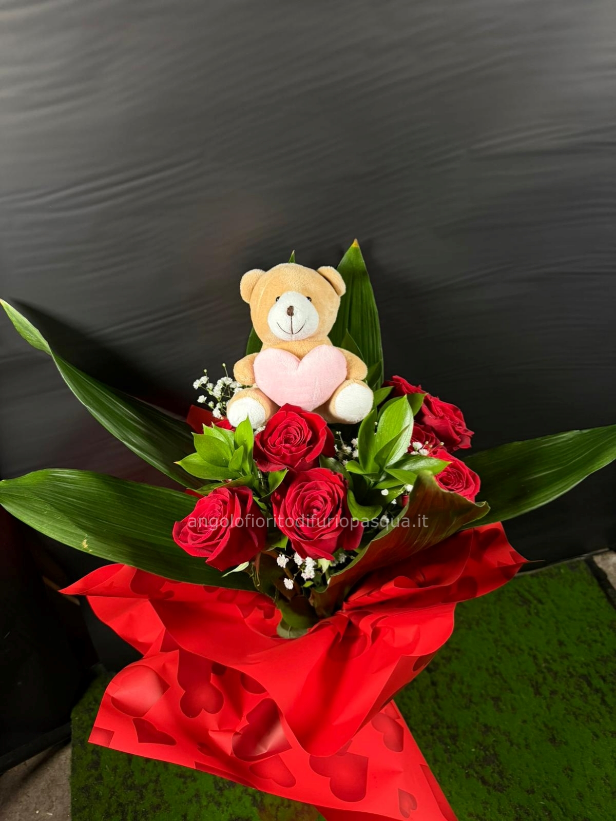 Bouquet di rose rosse con orso di peluche