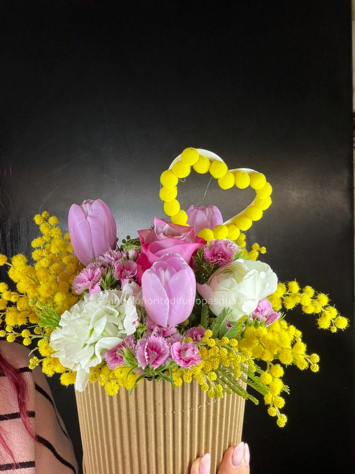 Cofanetto con composizione floreale con mimosa e cuoricino. L'omaggio è sempre confezionato con carta o materiali simili e fiocco colorato, secondo la nostra sensibilità e come d'uso locale. Saremo ben lieti di essere comunque contattati per soddisfare le Tue particolari esigenze. La confezione sarà consegnata dal fiorista direttamente al destinatario. Quanto sopra fatte salve le diverse disposizioni che potrai inserire nel campo note, presente nella pagina di conclusione dell'ordine (non vincolanti se non concordate prima con noi).